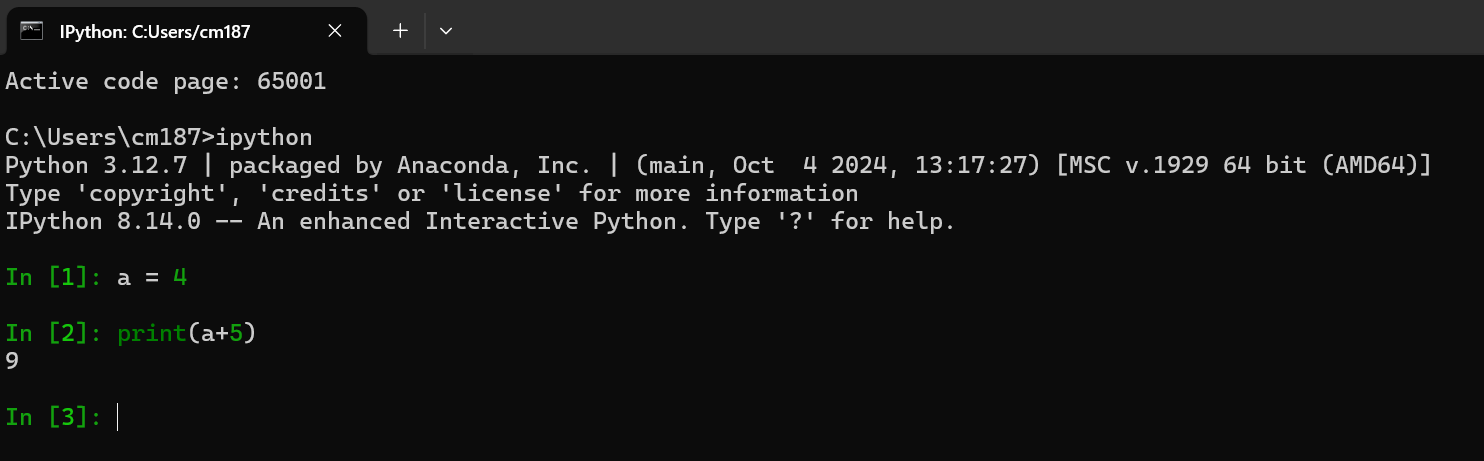 安装完成后,您可以在命令行中输入ipython命令来启动IPython环境。您将看到一个类似于In [1]:的提示符,表示您可以开始输入和执行 Python 代码了。